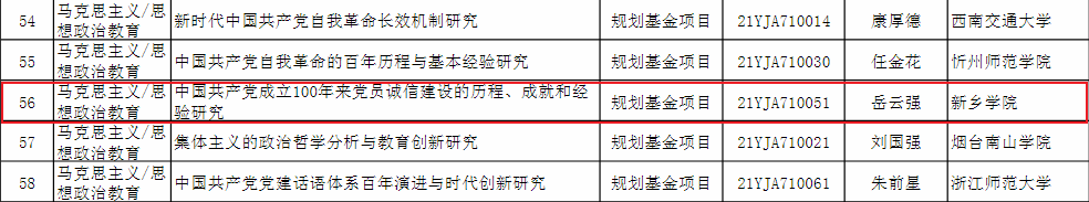 2021年8月19日,教育部社会科学司公布了2021年度教育部人文社会科学研究一般项目立项结果,公司岳云强教授的《中国共产党成立100年来党员诚信建设的历程、成就和经验研究》获规划基金项目立项。