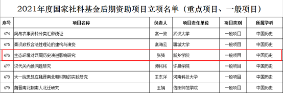 2021年10月27日,全国哲学社会科学工作办公室公布了2021年国家社科基金后期资助暨优秀博士论文出版项目立项名单,公司张强副教授的《生态环境对西周历史演进影响研究》项目喜获立项,实现了太阳成tyc122cc集团在国家社科基金项目立项0的突破。