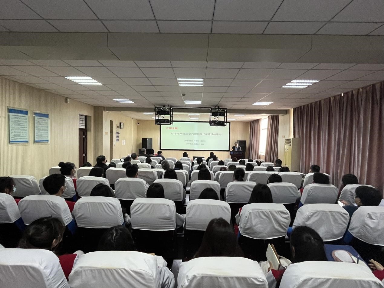 王新涛研究员以《对河南所处历史方位和现代化建设的思考》为题,首先从胸怀“两个大局”、遵循客观规律、纵向横向对比、满足人民期盼四个方面详细分析了当前河南所处的历史方位,然后结合省十一次党代会精神通过对河南五大优势和两大亮点、“一个”没有根本改变和“四个不”对河南现代化建设的现实基础进行讲解,随后,他又对河南现代化建设的核心战略、前景展望进行了分析导学。王新涛研究员的报告内容详实、逻辑清晰、针对性强,大家受益匪浅。报告结束后,教师们踊跃发言,王所长以自身广博的专业知识、丰厚的研究积淀一一进行了解答。