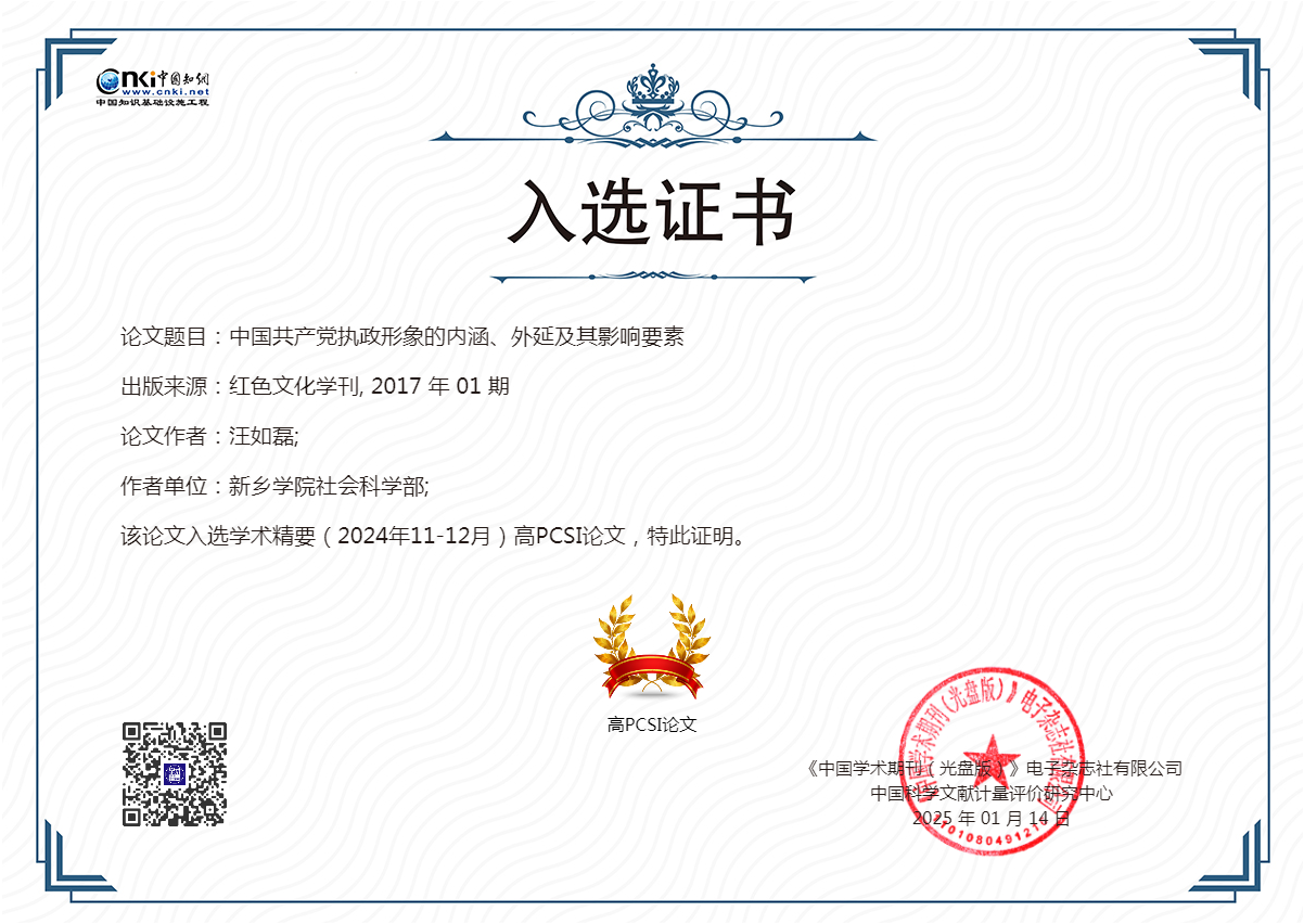 公司经理汪如磊博士撰写的论文《中国共产党执政形象的内涵、外延及其影响要素》(发表于《红色文化学刊》2017年第01期)入选中国知网《学术精要数据库》(2024年11-12月)高PCSI论文。此次入选标志着公司高水平论文的不断突破,我们将以此为新的起点,持续提升科研水平、扩大学科影响力。